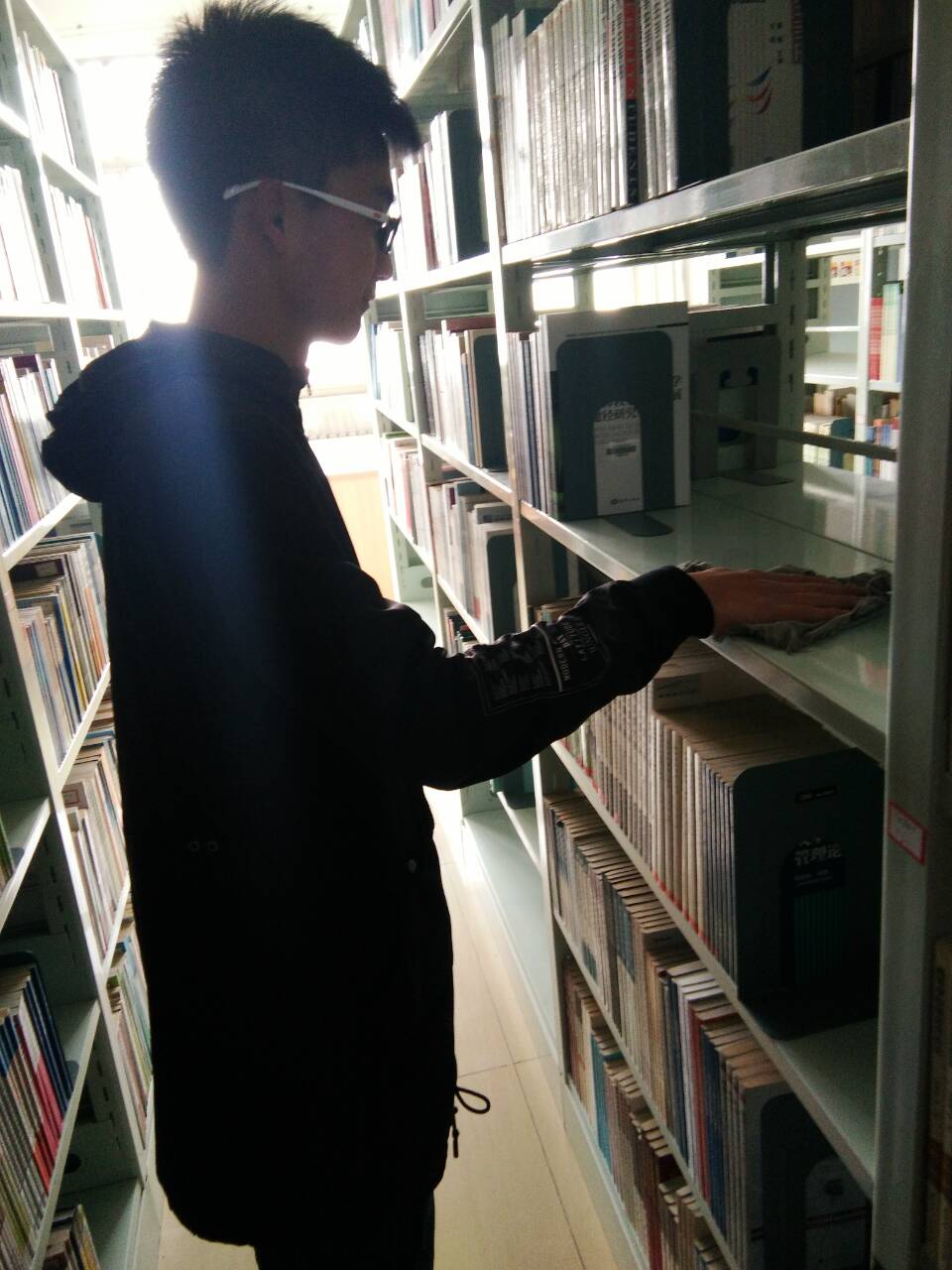 上午志愿者们带着自备的抹布,水桶等在图书馆门口集合好。随后,志愿者们自发分为8个小组分别对1至8楼进行清洁活动。清洁过程中,同学们仔细认真的擦拭书架,团结互助,尽可能的减少了对图书的损坏。