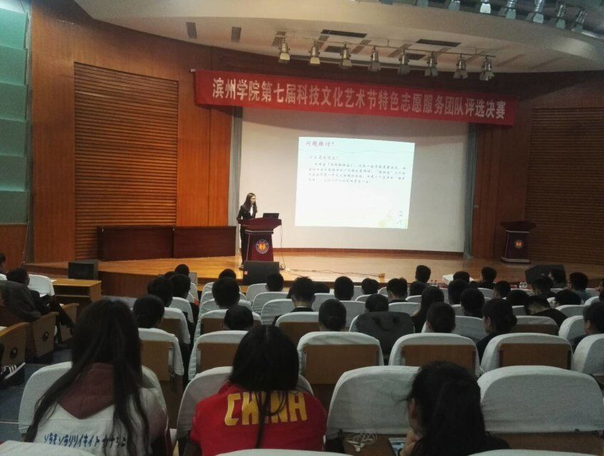 4月24日,beat365官网参加了由滨州学院举办的第七届科技艺术文化节特色志愿服务团队评选决赛。由14级柏广明同学代表学院团队上台答辩。