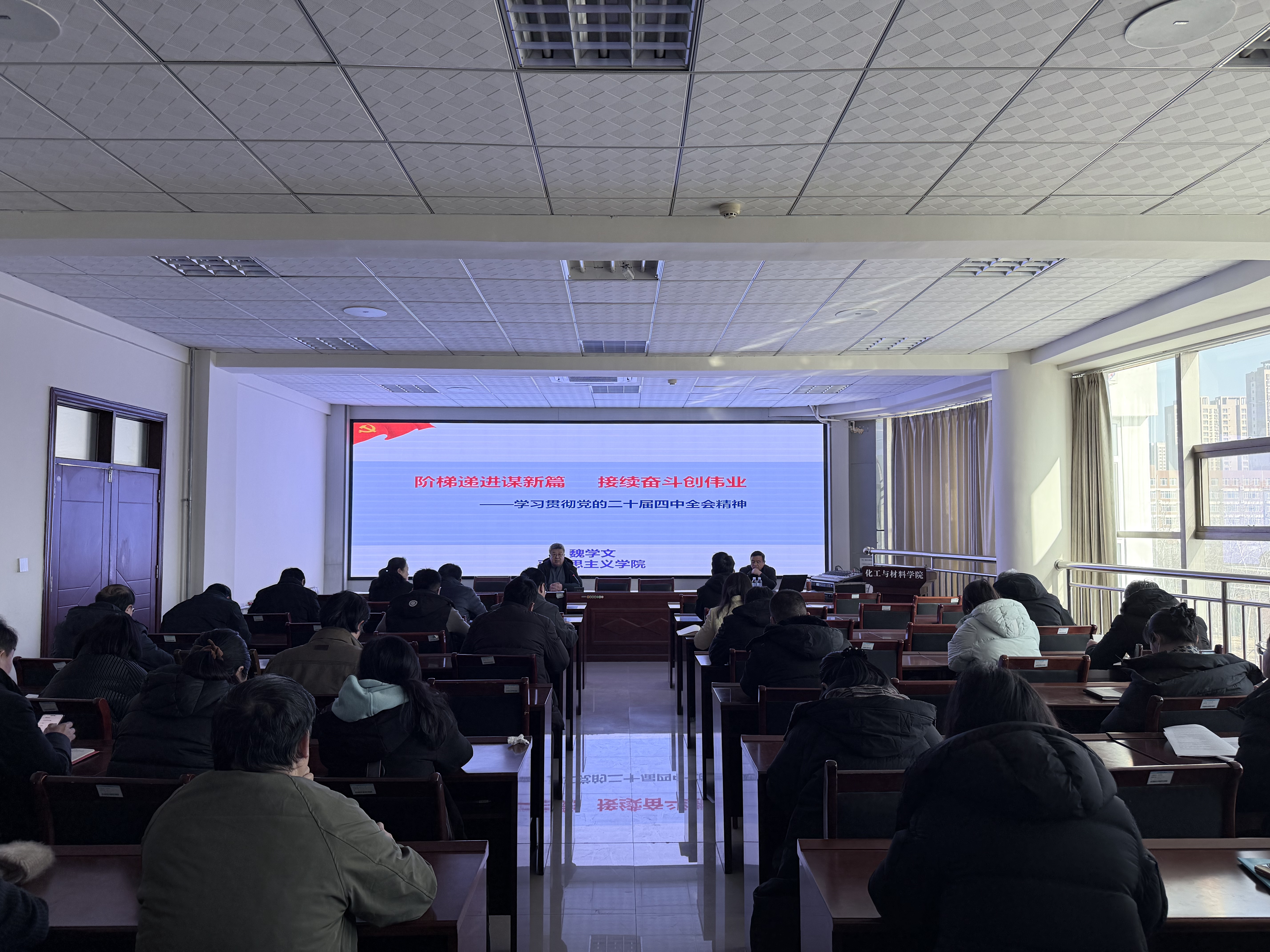 为深入学习领会、全面准确把握党的二十届四中全会精神的核心要义,beat365在线唯一官网党委1月13日在9-313会议室举办了“党的二十届四中全会精神解读”专题讲座。本次讲座特邀学校宣讲团成员、马克思主义学院魏学文教授担任主讲。讲座由学院党委书记主持。学院党政领导班子成员、全体教职工党员及部分师生群众参加了学习。