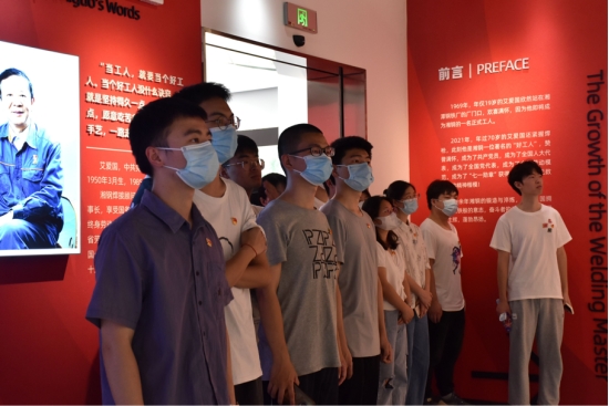 展馆内一张张工作照片,一个个精彩的奋斗故事,让参观者仿佛看到了艾爱国在湘钢的近两万个日夜,他用精益求精的态度,打磨、精进技术,始终秉持着他要“当一个好工人”的信念。艾爱国的事迹让大家心潮澎湃,同学们深深被他奋斗拼搏的精神所感动,纷纷拿出手机拍照记录。“艾爱国是我的老乡,作为一名大学生党员,我看到的不仅仅是艾爱国工匠的这种刻苦钻研、勇于拼搏的工作态度,我更在他的背后,看到了那种为国家无私奉献的高洁品格。这不就是一名党员的红色初心吗,不就是我们永远学习的榜样吗。”经济学1982班龙贺君参观完展馆后说道。