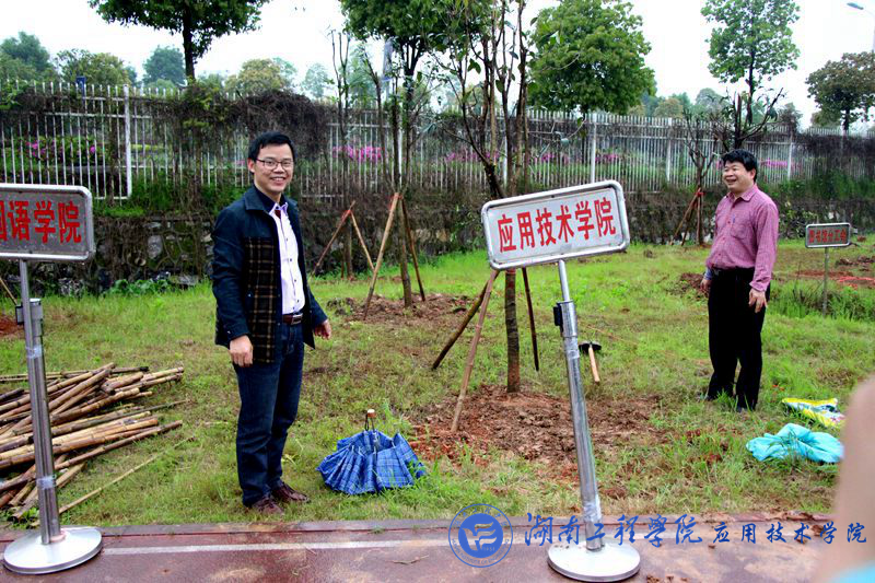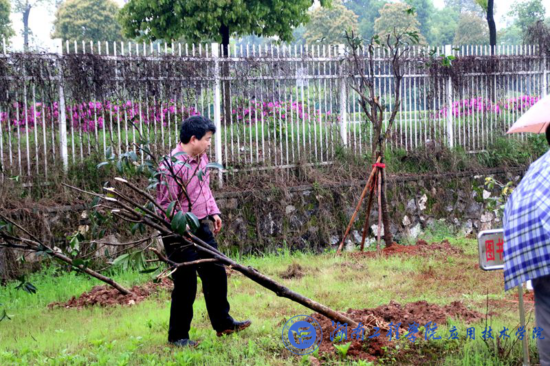往一个偏僻的小角落看去,澳门电子pg游戏官网党总书记李爱国穿着雨衣带领几位老师在认真的一锹锹从旁边铲起土填入树坑,慢慢的堆砌起围堰,填满崭新的新土,再提桶浇水,道道工序亲力亲为。似乎桂花树也感受到了周围的细心,稳稳的挺在风雨中。