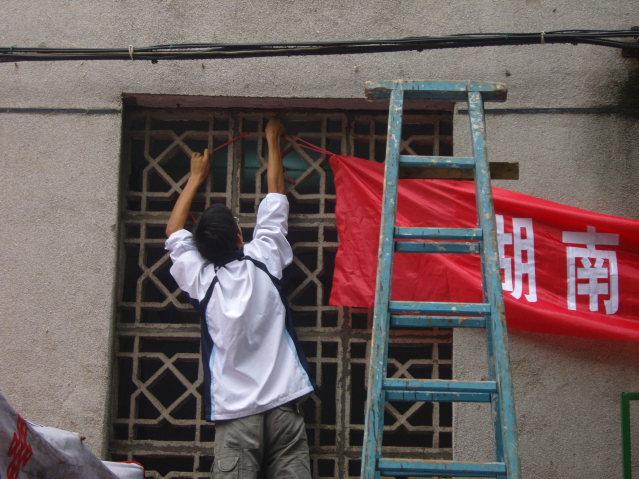 当记者发现张楚峰时,他正站在双角楼梯上,忙着将“澳门电子pg游戏官网”的大横幅粘贴在高楼的墙壁上。因为是阴雨天气,也给“高空作业”的他带来了不少困难,还好,一切都在井然有序地进行着,忙完迎新工作的前期准备后,他才感觉肚子饿了,这才走进食堂吃早餐。