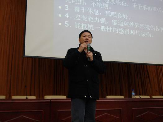 黄老师以提问的方式开始了此次讲座,他问在场同学:“你们觉得人生中什么最重要?”同学们各抒己见:“健康”、“亲情”、“爱情”、“事业”…….待同学们说完,黄老师笑道:“不错,人生有很多重要的东西,其中健康是1,事业、亲情、爱情等都是它后面的0,1没了,那0也就没作用了。”说完,同学们都赞同的点了点头。接着,黄老师借世界卫生组织对健康定下的十大标准向同学们阐述什么才是真正的健康。他说:“健康被世界卫生组织细分为“五快”和“三良”,五快:即吃得快、便得快、睡得快、说得快、走得快,这主要是身体上的;三良:即良好的人格、良好的人际关系、良好的处世态度,这是心理上的。所以,身、心都健康才是真正的健康。”随后,他道出大学生心理健康的评价标准:智力良好、自我意识明确、情绪积极、人格完整、意志健全、人际关系和谐、适应能力强。最后,他说到心理问题的普遍性,强调要正视心理问题,及时治疗。同时,他就大学生的身心健康提出两点建议:一是养成良好的个人生活习惯;二是养成健身运动的习惯。