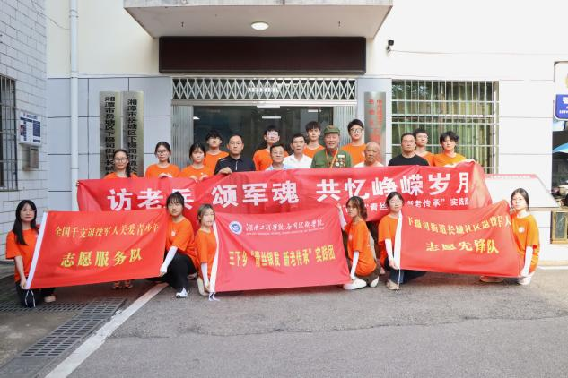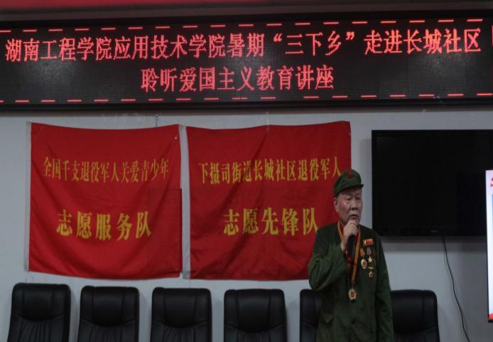 缅怀革命先烈,践行青春之梦。为进一步继承和弘扬爱国拥军的光荣传统,深入领悟红色精神,传递革命火炬。7月9日下午,澳门电子pg游戏官网“青丝银发 新老传承”三下乡实践团来到了湘潭市下摄司街道长城社区聆听爱国主义教育讲座。澳门电子pg游戏官网党委副书记陶连洲,下摄司街道主任毛超群,指导老师周岳崇,社区退役老兵同志们以及“三下乡”实践团全体成员参加。