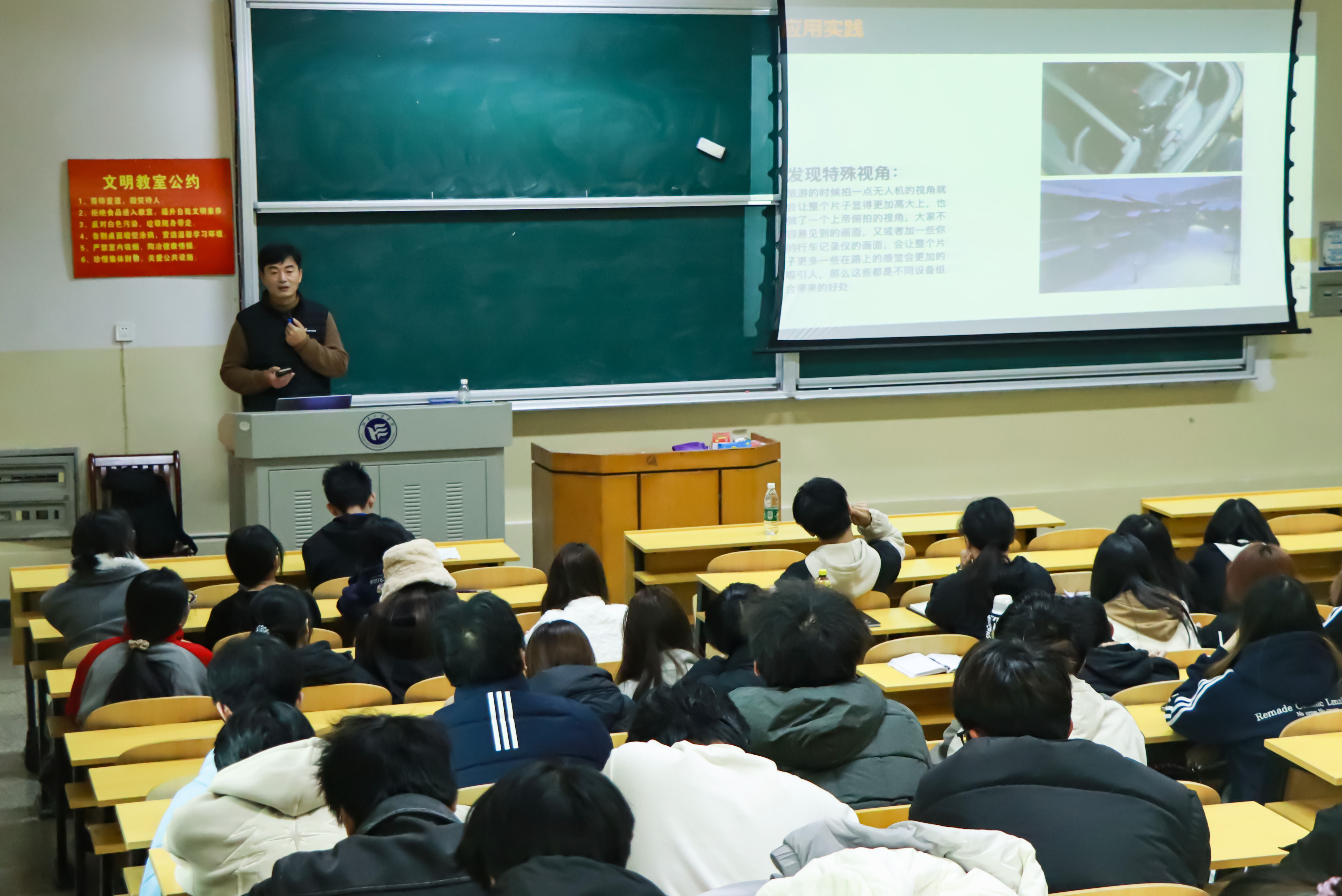 为加深同学们的理解,王彬现场展示了他本人以及往届创作的多元类型短视频作品,分享了在创作过程中遇到的挑战、解决的思路以及收获的经验,让同学们直观感受到灵感到成品的转化过程。他勉励同学们积极利用新媒体平台,发挥创意,展现新时代青年的思考。