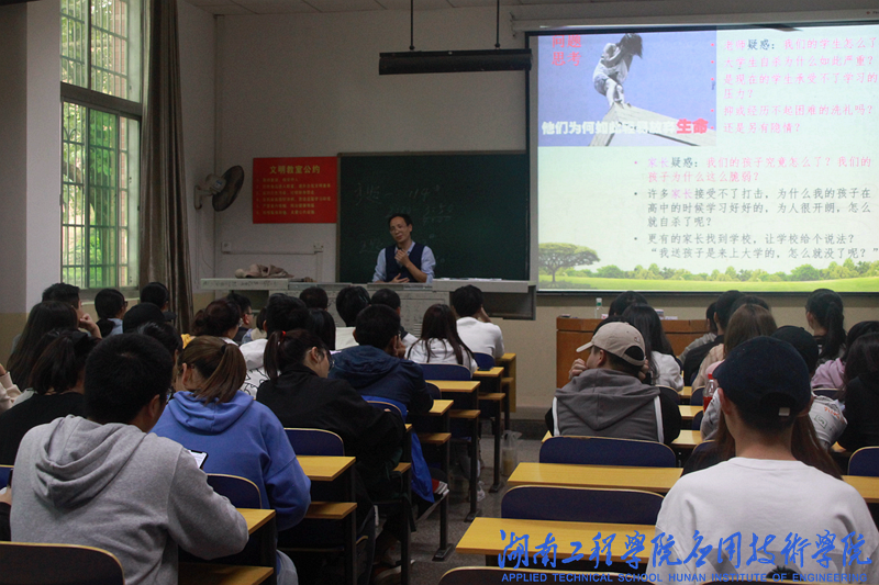 包卫主讲“大学生常见心理问题及调适”,他首先通过游戏让同学们更好的了解心理问题方面的相关知识。包卫以江苏大学某在校大学生因学习困难等原因从教学楼坠楼身亡案例讲述了大学生面临的心理问题,并指导大家科学认识恋爱与性心理问题,大学生网络成瘾问题,性格和情绪问题。