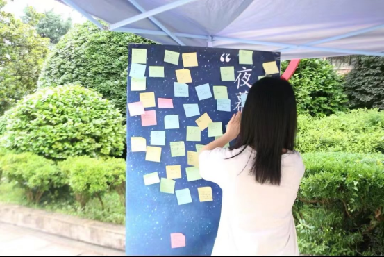 5月25日,心理部开展“夜幕下的音乐”“无人区的玫瑰”线下活动。“夜幕下的音乐”主题活动以便签为载体,向陌生人推荐歌单。大家纷纷将喜欢的音乐写在便签上,期待夜幕降临之际,心爱的歌曲出现在他人的歌单中,以乐会友,遇见美好。“无人区的玫瑰”旨在给同学们提供了一个向身边人表达自己的感谢与爱意的契机,鼓励大家勇敢地表达爱、接受爱。玫瑰、满天星、向日葵......向爱的人表达“我爱你”,即可获得一束鲜花。“我通过短信给父母、好友以及男朋友说了‘我爱你’,不仅获得了美丽的花,也对重要的人表达了爱意,很有意义。”经济学2182班侯佳怡表示。
