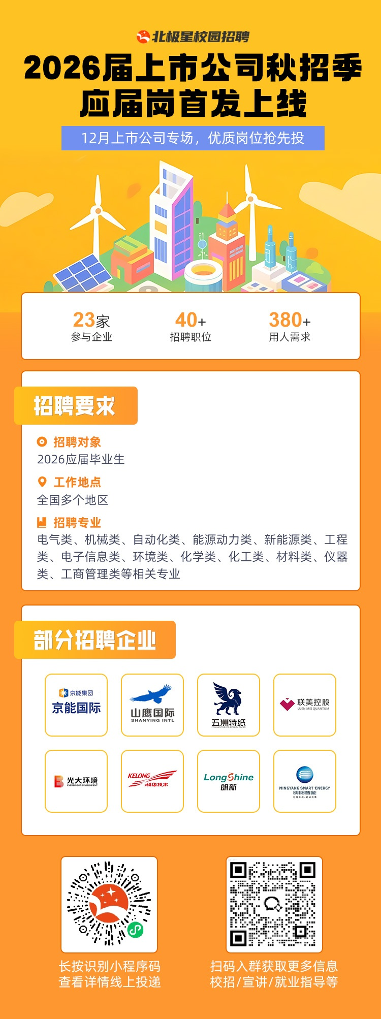 岁末钟声渐近,12月的寒意裹挟着机遇的暖流,为即将踏入职场的学子们铺就一条通往未来的星光大道。在这个充满收获与展望的季节,上市公司校招专场如约而至,成为众多企业与青年才俊双向奔赴的重要舞台。作为行业领军者,各大上市公司以开放的姿态、前瞻的视野,携优质岗位与成长平台而来,旨在挖掘潜力无限的新生力量,共绘发展蓝图。