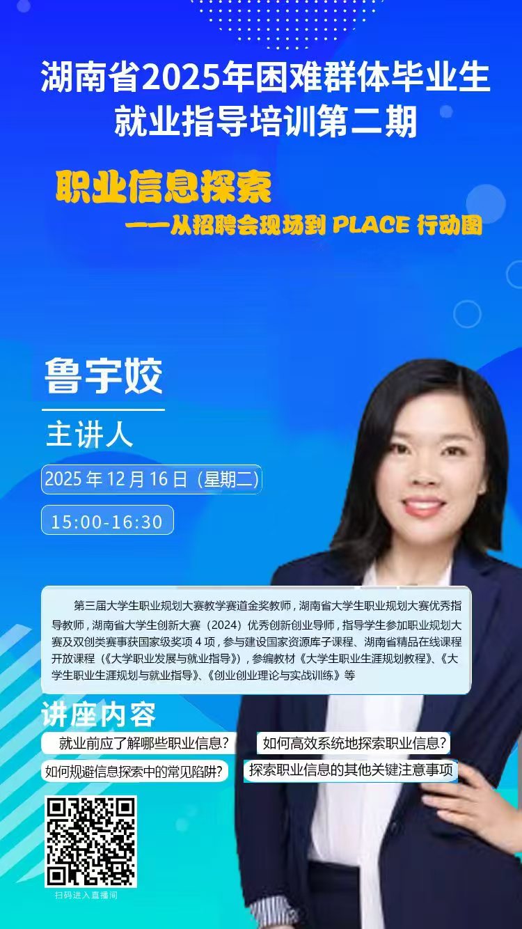 “湖南省 2025 年困难群体毕业生就业指导培训(第二期)”第二场于12月16日(下午)15:00—16:30开展