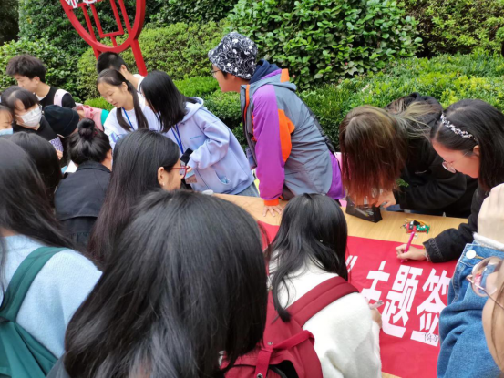 活动前期,心理部通过海报、新媒体平台等进行活动的预告和宣传。11月4日,活动正式开始,主题签名活动在校园食堂前、主路旁等人口流动大的场所开展,学生踊跃参加,签名现场气氛热烈。同时心理部在校园内发放印有心理健康宣传知识的书签,并安排干事着人偶服通过拿着相关的海报和同学们求拥抱。