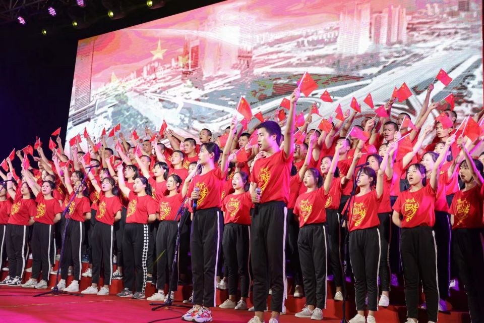 “祝伟大祖国生日快乐”,演唱最后,新生们挥舞手中的五星红旗,献礼伟大祖国七十华诞。歌声停下,全场响起了热烈掌声,澳门电子合唱曲目《祖国不会忘记》完美结束!