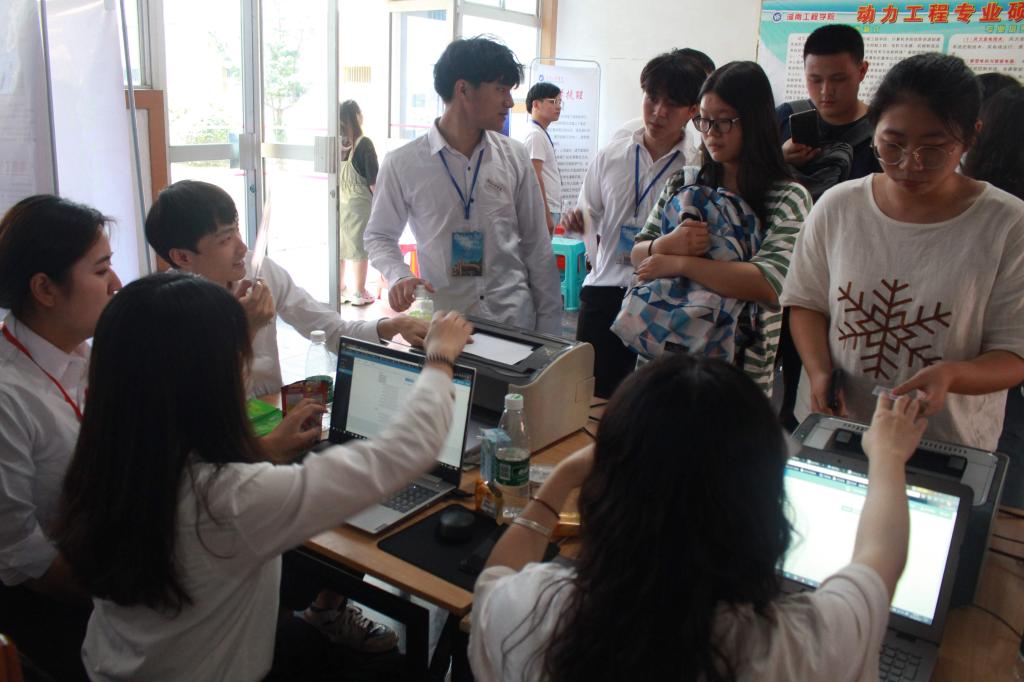 南校区电气大楼前坪迎新报到现场设有各班注册点,家长学生休息处、医疗服务点、入学资料发放处和绿色通道站等资讯和服务站。校园内随处可见身穿白色衬衣、戴着工作证的迎新志愿者,他们引导新生完成注册报到、领取生活用品、帮忙提取行李、带领新生熟悉学校各个地方。志愿者们热情周到的服务很快消除了新生们初来乍到的陌生感。新同学对志愿者们的热情服务表示感谢,并表示以后愿意加入迎新工作者的行列,以回报学长学姐们的热情付出。