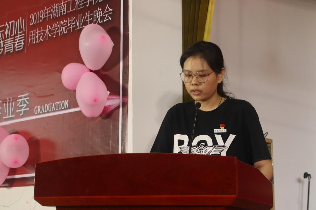 教师代表周舟妤栎作临别寄语,为毕业生送上祝福和期盼,“未来不可预期,请以梦为马,勇闯天涯!”。会计学1581向梦宇同学代表全体毕业生发言,她追忆大学青春岁月,表达对老师们最诚挚的谢意,对母校的无限感激与眷恋,同时作为一名即将奔赴新疆的基层工作者,她立志:选择去边疆去基层是今生无悔的选择,以后不管身处何处,面对怎样的挑战,都将一如既往,砥砺前行。机械设计1683李思佳代表在校学生发言,感恩学长学姐们的无私帮助,并为毕业生送去诚挚的祝福。