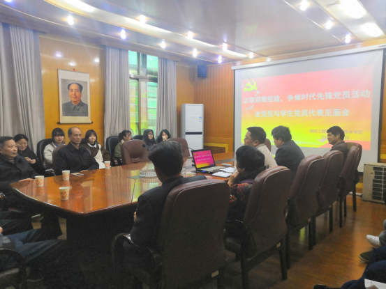 2019年4月11日下午3时,澳门电子pg游戏官网在办公楼会议室召开“汲取前辈经验,争做时代先锋——老党员和学生党员代表见面会”,参会人员有:陈运甫、罗佑凯、汤正平、曾去疾、凌扬云、朱建农、李京湘七名退休老党员、澳门电子pg游戏官网党总支书记李爱国、副书记徐粤宇,以及24名学生党员代表。徐粤宇主持见面会。