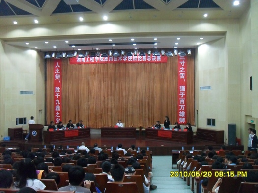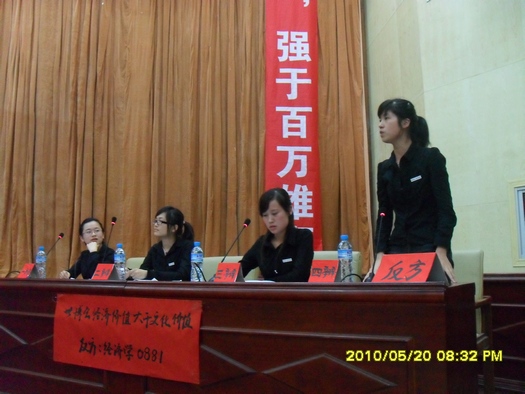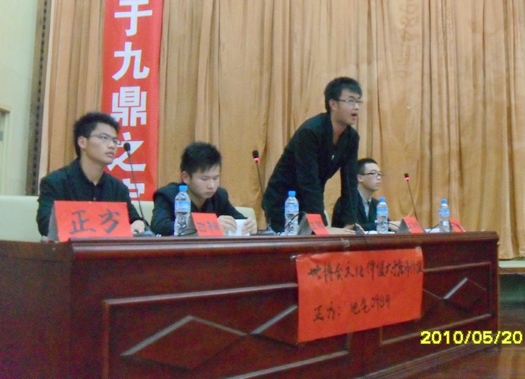 本场辩论赛的正反双方都是经过一轮轮激烈的比赛脱颖而出的优秀队伍,他们分别是正方电气0984班和反方经济学0881班,正反双方就“世博会文化价值大于经济价值还是经济价值大于文化价值”的问题展开了争论,为观众带来了一场听觉上的盛宴。本场辩论赛共分六个环节,分别为:开场陈词、攻辩、自由辩论、总结陈词和观众提问。在开场陈词环节中,正反两方就展示了非凡的归纳总结能力,双方一辩侃侃而谈,给大家留下了深刻的印象;接着,在攻辩环节,正方三辩王兴宇、反方二辩易嘉欣和四辩陈博连续犀利的反问赢得了满场的喝彩;其后,在自由辩论环节,双方展开了激烈的交锋,正方三辩王兴宇就世博会的真正价值给以反问,而反方也毫不示弱,引经据典、据理力争,双方唇枪舌剑的自由辩论使比赛迅速上升为白热化。最后总结陈词阶段,反方四辩陈博接连举例,进一步论证了世博会经济价值更大、更广、更直接,有理有据,赢得了评委的认同。六个环节结束后,刘永湘老师和单化任主任分别对本次辩论赛做了总结,他们就本次大赛的论点进行了分析并阐述了自己的看法,也指出选手们的不足之处,肯定了辩手们的能力,借以表达了感受和希冀。