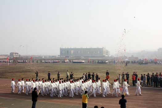 伴随着《运动员进行曲》激昂的旋律,在澳门电子组成的彩旗队引领下,各学院方阵队开始了各自的表演,这既是开幕式的表演,也是在比赛之初显示自身实力的一个平台。澳门电子方阵身着白色运动服,头戴红帽,纯净安宁中透着热情,如此装束让人觉得他们激情无限!英姿挺拔的出现在人们面前,他们迈着坚定的步伐,稳步踏在红白相间的跑道上,激情四射、斗志昂扬;他们喊出“应院健儿,勇踏征途,宝剑出鞘,谁与争锋”的口号,嘹亮有力,让在场的人们倍感振奋!当他们途经主席台,大家都在为他们欢呼!感受到我们如火的青春正在蓬勃燃烧!澳门电子方阵实力不俗,在行走途中将队形由方形变为菱形,整个方阵在变化过程中整齐有序、不慌不忙,在其平稳中我们能见其功底的超脱!