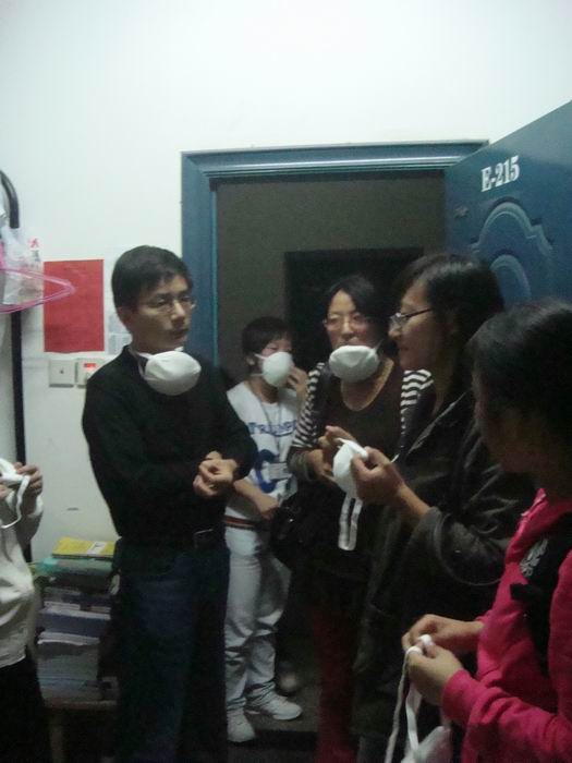 11月9日晚6:20,抗甲流小组来到主校区(新)EF栋宿舍开始了上门发放口罩工作。小组成员们戴着厚厚的口罩、搬着重重的箱子、轻轻地敲门,把1200多个口罩一一发到同学们手中,并给了温馨的提示,他们以言行告诉大家:甲流并不可怕,重要的是大家应该做好自身的工作。面对同学们各种形式的谢意,小组成员们都是会心的一笑,然后又投身于自己的工作中。