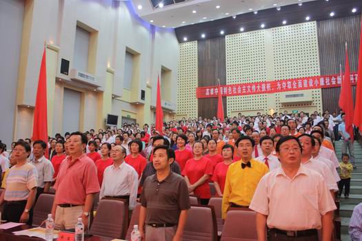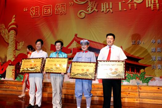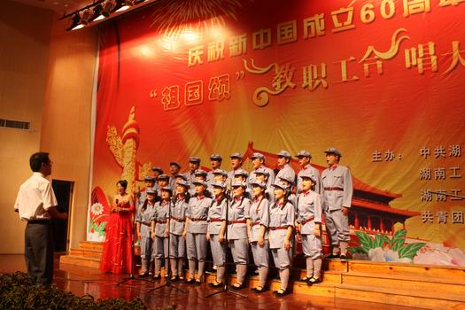 为庆祝中华人民共和国成立六十周年,弘扬和振奋民族精神,激发教职工爱国热情,铭记革命历史,9月29日7:30,在图书馆一报告厅学校举行了以“祖国颂”为主题的教职工合唱大赛。大赛由学校党委、学校行政、校工会和校团委联合主办。省教育厅党组成员、省教育工会主席李宪华,省教育工会副主席王常华,省教育工会女工委主任杨兰英及学校党委书记谢伯端、校长刘国荣等领导出席了此次盛会。