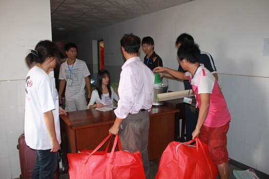 注册处:为了防止有H1N1病毒的输入,注册点即新校区食府二楼的门口配备了医疗人员严格把关,一一测量体温。此外,为了提高同学们的自理能力,并改善注册处空气的流通,从上午开始就有保卫处的人员劝导家长止步。同学们独自完成了所有的注册工作,下楼之后,他们脸上的笑容似乎是在对父母说:我已经开始适应大学里的自主自立生活了。