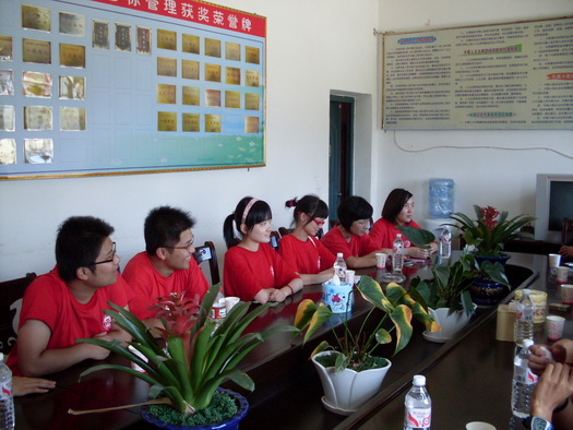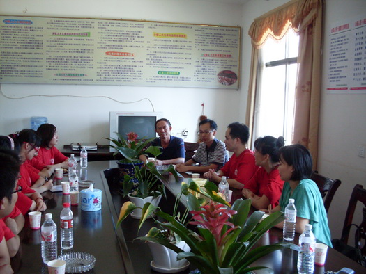 在短暂的内务整理后,服务团成员急切地想了解白仓镇的经济、文化及村民情况,以便更好、更快地投入到“三下乡”社会实践服务活动中去。下午4:00,在政府会议室,镇人大刘主席和镇团委邓书记与服务团成员召开了座谈会,首先,胡爱明老师就此次“三下乡”活动的目的作了说明,既是为了宣讲建国60周年的成就,也是为了提高大学生思想政治教育和加强大学生与农村建设的联系。接着,镇团委邓书记就新中国成立60周年来,白仓镇的基础设施建设、现代农业、文化建设及工业企业等方面的情况做了详细的介绍。邓书记说:近年来,在党中央政策的指引下,修建了标准灌溉水渠,农业得到了稳步发展,并确立了“烤烟、制种、香葱、水果、蔬菜、油茶、牲猪”七大产业;新修水泥路,实现了村村通水泥路;文化事业蒸蒸日上,新建了文化综合大楼,极大地丰富了群众的文化生活;农村面貌日新月异,筹建了标准化的镇敬老院、客运站、卫生院门诊大楼等设施。从邓书记的讲述中,我们能切实感受到白仓镇的变化给他们带来的喜悦。