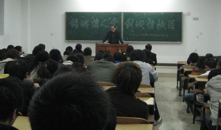 为了进一步增强大学生的诚信意识,提高大学生的思想道德素质,树立“学习诚信,生活诚信,交友诚信”的观念,塑造诚信大学生,努力打造诚信校园。按照澳门电子pg游戏官网首届诚信教育、征信知识宣传活动月的安排,12月14日晚上7:00,澳门电子大一至大四的所有班级举办了“人人知诚信 诚信我先行”的主题班会。各班班委会、团支部积极行动,精心组织了此次主题班会,其中市场营销0681班、市场营销0682 班、市场营销0881 班和工业设计0881班共同组织的主题班会最为引人注意。班委会、团支部不仅邀请了班主任文山东副院长、张利芝老师出席本次主题班会,还特邀了工商银行湘潭市泗神庙支行杨科益行长作了关于诚信为主题的讲座。杨行长就大学生诚信教育谈了自己的看法,他说,诚信对于个人成材和企业立足乃至整个民族繁荣的重要性,并指出大学生群体是未来社会主义市场经济的重要参与者,必须加强其知荣辱、树诚信的道德建设;呼吁将道德教育提高到与文化教育同等重要的地位;主张学校配合地方征信及信用评估活动,大力开展征信体系建设,积极推行大学生诚信档案制度。随后文山东副院长对此次主题班会作了总结,并要求同学们将诚信落实到行动上,对即将到来的期考要高度重视,坚决杜绝舞弊行为。英语0681班的同学更是别出心裁点起了蜡烛,在烛光下倾听诚信教育。通过此次“人人知诚信 诚信我先行”主题班会,同学们认识到了诚信对于自己、对于集体、对于国家的重要性,并且共同承诺在今后的学习和生活中,从小事做起,从行动上捕捉诚信,从而在心中树立一生的诚信。(记者:刘莹莹、刘 丹)