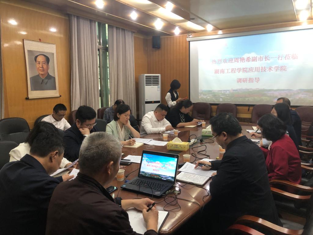 10月30日上午,湘潭市副市长周艳希等一行来学院调研。双方在学院办公楼207会议室召开座谈会。澳门电子pg游戏官网党委委员、副校长向前,澳门电子pg游戏官网党政主要领导,湘潭市教育局、高新区等部门负责人参加座谈。会议由向前主持。
